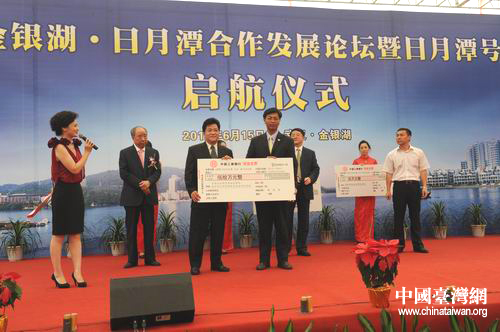 中國臺灣網6月15日武漢消息 6月15日,“金銀湖—日月潭合作發展論壇”暨“日月潭號”游船起航儀式在湖北武漢舉行,與會的全國臺企聯常務副監事長余明進,丹尼斯集團董事長王任生,武漢市東西湖區人民政府、東西湖區金銀湖街道辦事處等單位和個人得知臺灣南投縣遭受暴雨災害,共向南投縣災區捐款125萬元人民幣。