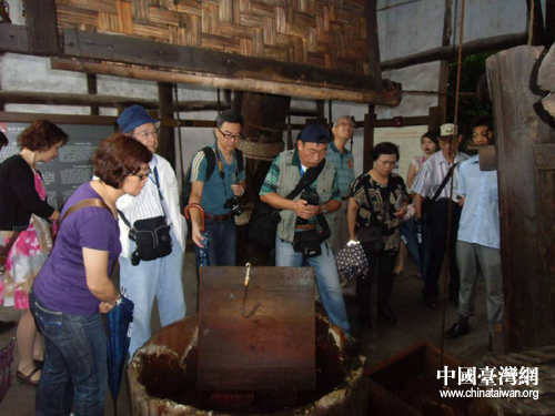 臺北社區大學參訪團一行在自貢久大鹽業集團公司舒平制鹽分公司鹽業展示廳參觀。(圖片來源:自貢市臺辦)