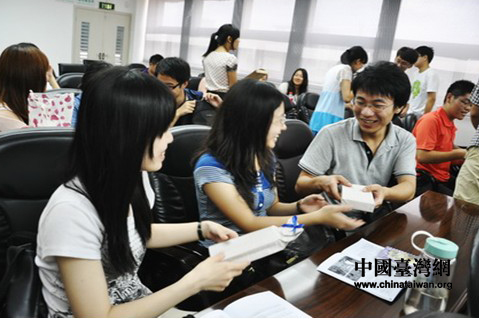 三峽大學(xué)自愿者與臺灣來宜師生互贈禮品。(中國臺灣網(wǎng)宜昌市通訊員 朱宜雄 攝)