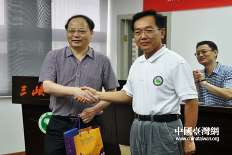 三峽大學(xué)副校長黃應(yīng)平與臺灣云林科技大學(xué)許仲佑互贈禮品。(中國臺灣網(wǎng)宜昌市通訊員 朱宜雄 攝)