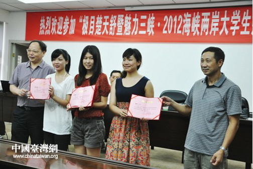 黃應(yīng)平向臺灣師生介紹了三峽大學(xué)的現(xiàn)有規(guī)模、院系設(shè)置等情況,并回顧了近些年來三峽大學(xué)與臺灣高校開展教學(xué)交流情況。開營儀式上,還為“2011·紀(jì)念辛亥革命一百周年海峽兩岸大學(xué)生征文”活動(dòng)10名獲獎(jiǎng)?wù)哳C發(fā)了獎(jiǎng)品;兩岸的師生還互贈了禮品,開營儀式簡短、熱烈。