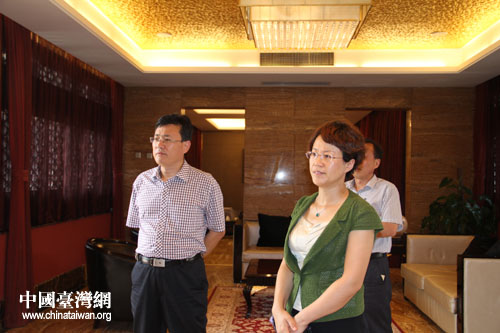 棗莊市委副秘書長、臺辦主任畢志偉陪同亓愛收考察酒店、賓館。(圖片來源:棗莊市臺辦)
