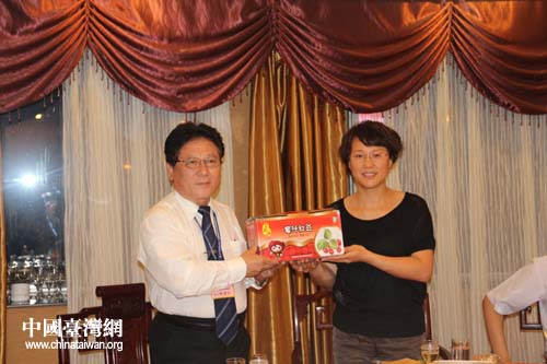 棗莊市委副秘書長、市臺辦主任畢志偉(右)與臺灣客人互贈禮品。(圖片來源:棗莊市臺辦)