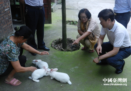 臺商金憶君(右2)與德陽市市長陳新有(右1)考察獺兔喂養。(圖片來源:綿竹市臺辦)
