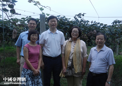 臺商金憶君(右2)與德陽市長陳新有(右3)考察后在獼猴桃種植基地合影。(圖片來源:綿竹市臺辦)