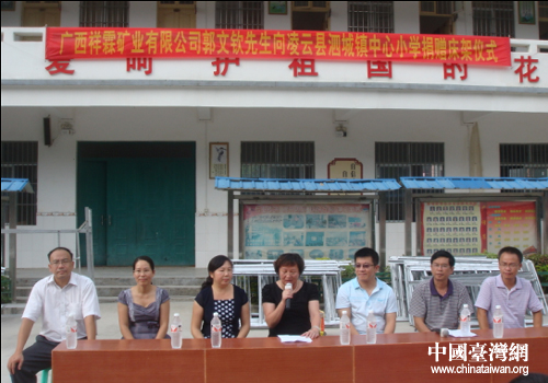 中國(guó)臺(tái)灣網(wǎng)9月17日百色消息 日前,廣西百色市凌云縣泗城鎮(zhèn)那甲小學(xué)全體師生收到了一份特殊的節(jié)日禮物——臺(tái)商郭文欽先生捐贈(zèng)愛(ài)心床架100套,價(jià)值4萬(wàn)多元人民幣。全體師生、當(dāng)?shù)剜l(xiāng)親在學(xué)校操場(chǎng)舉行愛(ài)心床架捐贈(zèng)儀式,度過(guò)了一個(gè)有意義的教師節(jié)。