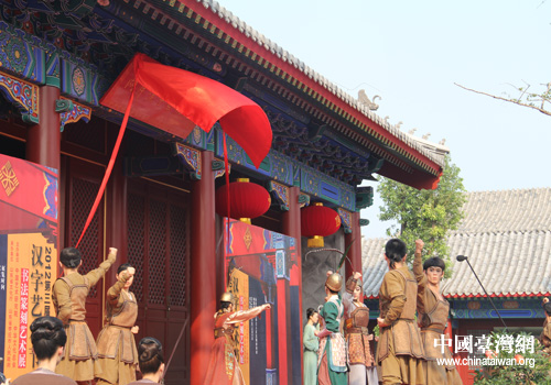 中國(guó)臺(tái)灣網(wǎng)9月20日棗莊消息 近日,第三屆兩岸漢字藝術(shù)節(jié)在山東省棗莊市舉行,臺(tái)灣漢唐樂府一行70余人前來(lái)助興表演,給兩岸游客上演了一場(chǎng)穿越時(shí)空的“藝術(shù)盛宴”。置身其中,仿佛時(shí)光倒轉(zhuǎn)。表演將觀眾從嘈雜的塵世中帶進(jìn)了遙遠(yuǎn)的漢唐時(shí)代,讓觀眾與漢唐壁畫中的仕女們進(jìn)行了一次清新地交流。