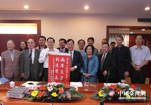 座談會上,臺北市四川同鄉會贈送了“兩岸交流,創造雙贏”錦旗。(中國臺灣網南充市臺辦通訊員 張國友 秦榕聆)