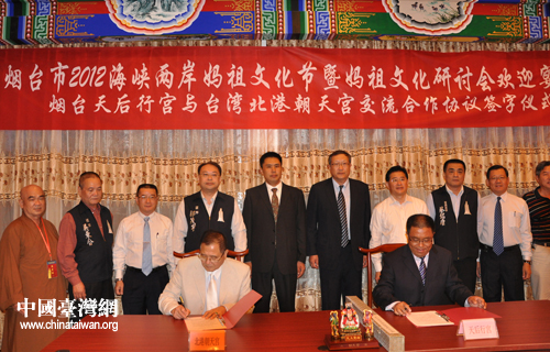 中國(guó)臺(tái)灣網(wǎng)9月23日煙臺(tái)消息 9月22日晚,參加煙臺(tái)市2012海峽兩岸媽祖文化節(jié)暨媽祖文化研討會(huì)的“煙臺(tái)天后行宮”與“臺(tái)灣北港朝天宮”,在煙臺(tái)臺(tái)商會(huì)館舉行交流合作協(xié)議簽字儀式。