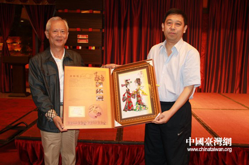 陜西省臺辦主任閆超英向臺灣客人贈送禮品。(陜西省臺辦供圖)