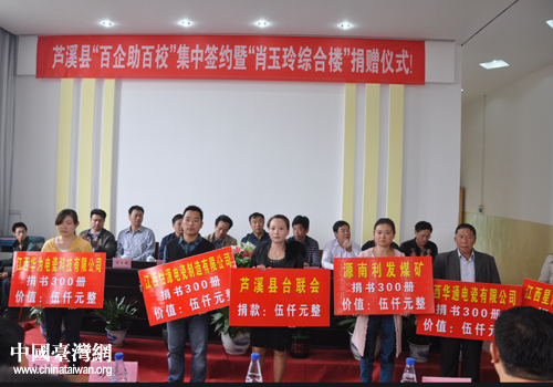 中國臺灣網(wǎng)11月5日蘆溪消息 日前,在蘆溪縣“百企助百校”集中簽約暨“肖玉玲綜合樓”捐贈儀式上,蘆溪縣臺聯(lián)會慷慨解難為長豐鄉(xiāng)學(xué)校捐資5000元,用于改善學(xué)校辦學(xué)條件。(中國臺灣網(wǎng)蘆溪縣臺辦通訊員 童麗)