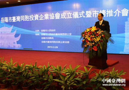臺灣海基會董事長林中森在岳陽市臺協會成立大會上致辭。(圖片來源:岳陽市臺辦)