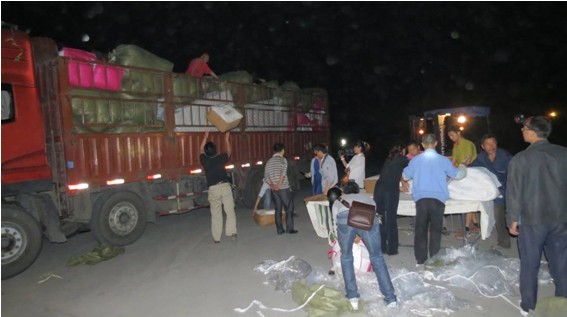 4月21日凌晨,臺資企業寬庭家居制品有限公司員工連夜裝載救災品出發前往災區。