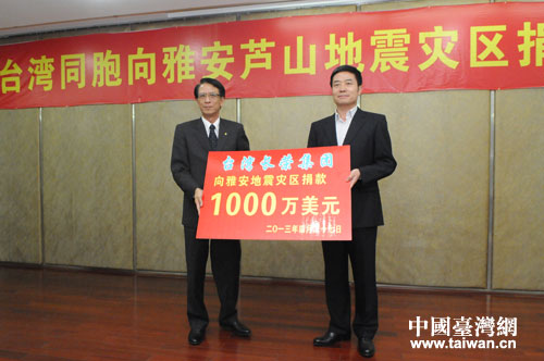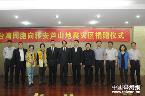 捐贈儀式上,長榮集團捐款1000萬美金(約合6170萬元人民幣),是目前向雅安蘆山地震災區捐款數額最多的臺資企業;大潤發捐贈1000萬元人民幣,包括300萬元資金和700萬元物資;臺灣宗教團體佛光山捐款1000萬新臺幣(約合208萬元人民幣);新光三越百貨股份有限公司捐款100萬元人民幣。四川省副省長甘霖出席捐贈儀式,并代表四川省人民政府接受臺灣同胞捐贈。