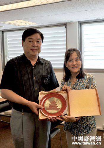 北京市臺辦副主任高振生和臺中市新聞局局長石靜文交換禮物。(圖片來源:第十三屆京味文化之旅交流團)