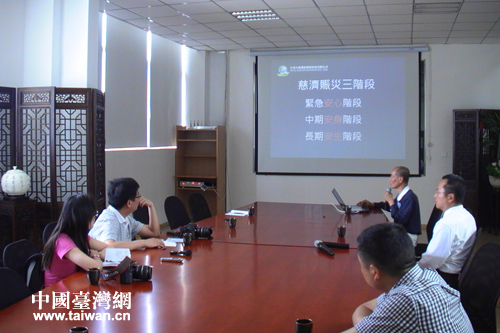 志工陳哲霖向記者介紹臺灣慈濟會對川援建情況。(德陽市臺辦 尹顯斌 攝)