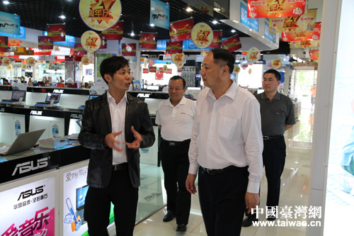 山東省臺(tái)辦巡視員張志強(qiáng)在臺(tái)資企業(yè)百腦匯淄博店考察時(shí)與臺(tái)商交談。(圖片來(lái)源:淄博市臺(tái)辦)