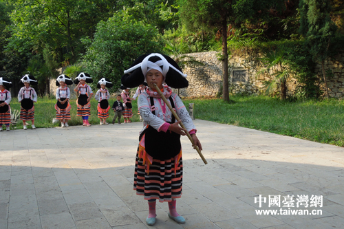 長角苗女孩表演獨有的樂器——三眼蕭。(六盤水市臺辦 蔣承琳 攝)