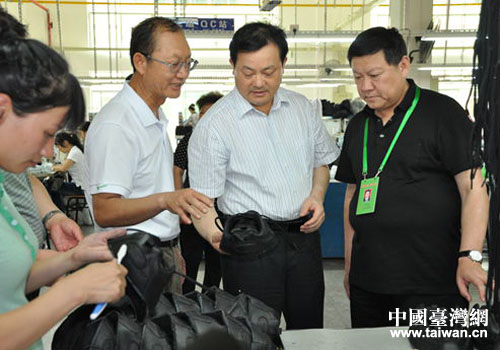 永州市委黨委、市委副市長(zhǎng)易佳良(中),寧遠(yuǎn)縣委書記嚴(yán)興德(右)在寧遠(yuǎn)臺(tái)資企業(yè)華榮鞋業(yè)總經(jīng)理曾文鋒(左、臺(tái)胞)陪同下參觀生產(chǎn)車間。(圖片來(lái)源:永州市臺(tái)辦)