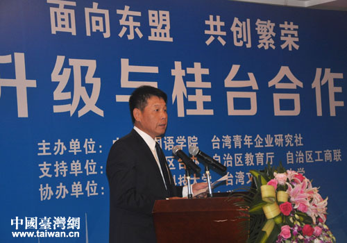 中國(guó)臺(tái)灣網(wǎng)6月17日南寧消息 6月15-16日,產(chǎn)業(yè)升級(jí)與桂臺(tái)合作論壇在南寧召開。來自桂臺(tái)兩地機(jī)構(gòu)、企業(yè)負(fù)責(zé)人,高校教授、科研院所專家學(xué)者等工商、教育、學(xué)術(shù)界代表200多人出席論壇。廣西臺(tái)辦主任劉侃、廣西北部灣辦公室常務(wù)副主任李延強(qiáng)、廣西外國(guó)語(yǔ)學(xué)院董事長(zhǎng)朱桂玲,臺(tái)灣青年企業(yè)研究社理事長(zhǎng)趙雪玲、臺(tái)灣元大國(guó)際資產(chǎn)公司董事長(zhǎng)林武田、臺(tái)灣常春藤外語(yǔ)培訓(xùn)集團(tuán)董事長(zhǎng)賴世雄等出席論壇并致辭。
