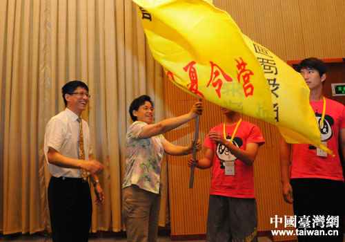 四川省委常委李登菊授本屆夏令營營旗。(圖片來源:四川省臺辦)