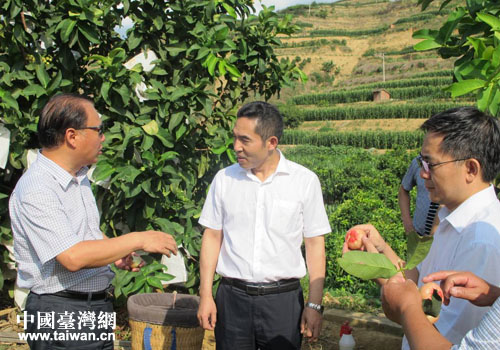 四川省臺辦副主任趙宇(中)在攀枝花鹽邊臺灣農民創業園考察調研。(圖片來源:四川省臺辦)