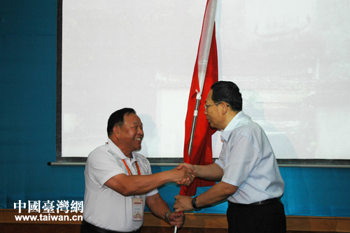 安徽省委副書記李錦斌向夏令營臺灣領隊老師授旗。(安徽省臺辦 裔淳 攝)
