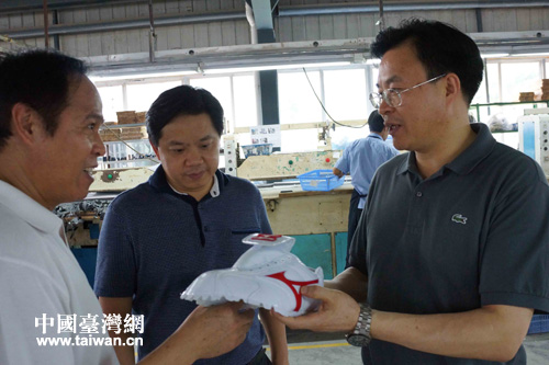 張軍詳細詢問中江臺企宏和鞋業產品生產情況。(德陽市臺辦 尹顯斌 攝)