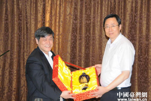 宿遷市委書記藍紹敏向臺灣知名學者、中原大學教授呂鴻德贈送紀念品。圖片來源:宿遷臺辦