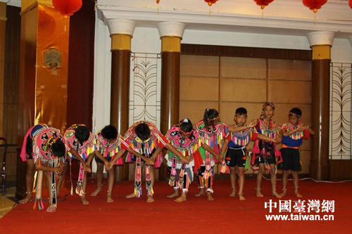 臺東縣豐里小學隊員表演臺灣阿美族舞蹈《母親的笑》。(圖片來源:黔南州、都勻市臺辦)