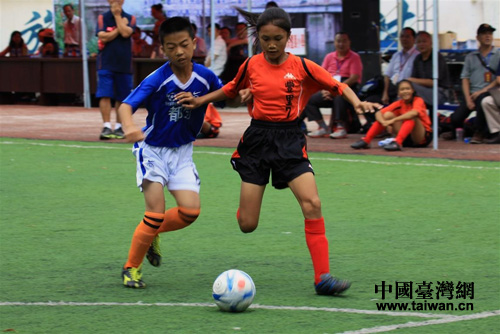 第六場,臺灣豐里小學少年足球隊與楊柳街小學少年足球隊爭奪第一名。(圖片來源:黔南州臺辦)
