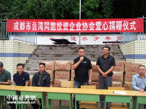 中國臺灣網9月4日成都消息 9月2日,成都市臺灣同胞投資企業協會常務副會長唐中柱一行前往雅安蘆山地震災區,在天全縣仁義初級中學舉行了成都市臺灣同胞投資企業協會愛心捐贈儀式,向在“4.20”地震中受災的仁義中學捐贈物資。雅安市臺辦副主任時勇等陪同前往。