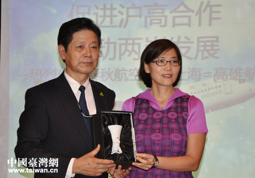高雄觀光局副局長劉顯惠(右)向春秋航空董事長王正華(左)贈送禮品。(上海臺協 玉龍 攝)