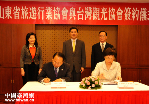 中國臺灣網10月31日臺北消息 日前,山東省旅游局和臺灣觀光協會在臺北圓山飯店簽訂合作協議,山東省旅游局于沖局長、臺灣觀光協會賴瑟珍會長代表魯臺雙方在合約上簽字。山東省夏耕副省長、臺灣觀光協會張學勞榮譽會長、山東省臺辦張雪燕主任等見證了簽字活動。