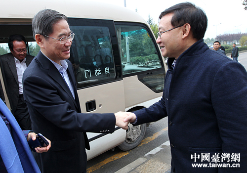 貴陽(yáng)市委常委、統(tǒng)戰(zhàn)部長(zhǎng)帥文(右一)迎接國(guó)務(wù)院臺(tái)辦張志軍主任。(當(dāng)代貴州雜志社 傅泊霖 攝)