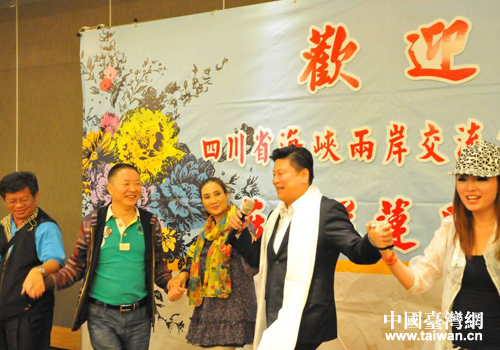 花蓮縣長傅崐萁(右二)設宴歡迎四川民族歌舞赴臺交流團一行,席間與交流團一行手拉手跳藏族歌莊。(圖片來源:四川省臺辦)