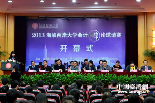 中國(guó)臺(tái)灣網(wǎng)12月9日南昌消息 日前,2013海峽兩岸大學(xué)會(huì)計(jì)辯論邀請(qǐng)賽開(kāi)幕式在江西財(cái)經(jīng)大學(xué)蛟橋園舉行。江西財(cái)經(jīng)大學(xué)副校長(zhǎng)鄧輝致歡迎辭,臺(tái)灣會(huì)計(jì)研究發(fā)展基金會(huì)委員謝國(guó)松、臺(tái)灣大學(xué)教授陳國(guó)泰、中南財(cái)經(jīng)政法大學(xué)教授湯湘希、臺(tái)灣參賽選手代表游佳璇先后發(fā)言。