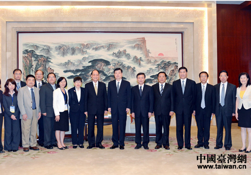青島市委李群書記在臺北向吳伯雄榮譽主席介紹青島團中的企業家。(圖片來源:山東省臺辦)