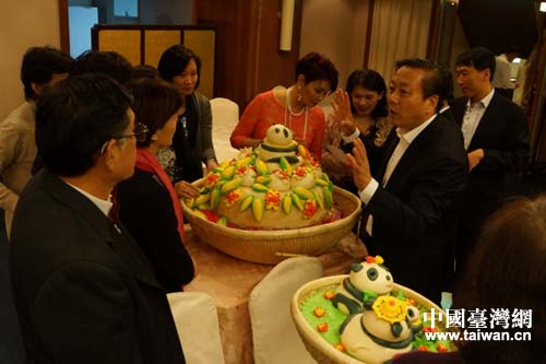 10月下旬,威海市委副書記、市長張惠率威海市經濟文化考察團赴臺參加“2013臺灣·山東周暨第十九屆魯臺經貿洽談會”,并舉辦了“走親戚、看歡喜、賀慶典”活動,出席臺北市立動物園建園99周年慶典暨臺灣贈送大陸梅花鹿、長鬃山羊祝福“圓仔”健康成長活動。為慶賀大熊貓“圓仔”出生而制作的入選山東省非物質文化遺產的威海大餑餑(用66公斤面粉制作的一組大餑餑)和柳編工藝品,一經出現在慶典上就引起了2萬多游園群眾的關注。