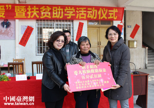 當天上午,市臺辦和市臺商協會共帶來6萬3千多元慰問金,向當地的60戶扶貧戶、低保戶、和五保戶以及32名貧困學生發放,并鼓勵貧困戶們努力發展生產,通過多種方式增加家庭收入,提高生活水平;隨后,又走訪看望了大崗村部分病困戶和貧困戶活動現場,同時捐贈了1萬元作為該村衛生村的建設金。