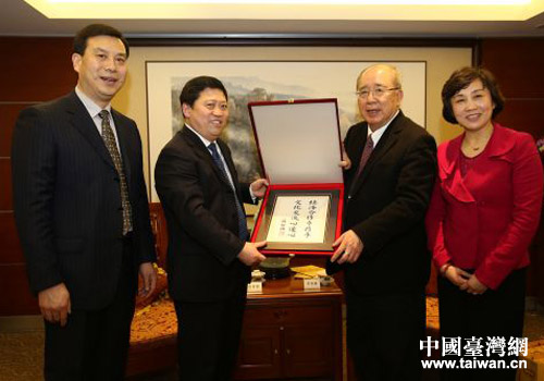 中國國民黨榮譽主席、“世界客屬總會”總會長吳伯雄(右二)贈送他為開封市的題詞。(圖片來源:開封市臺辦)