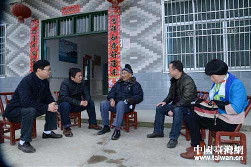 石門縣臺辦主任陳錦龍、所街鄉黨委書記蘇宏云看望唐熙隆老人。(圖片來源:石門縣臺辦)