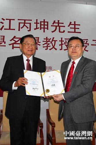 張榮校長向江丙坤先生頒發(fā)山東大學(xué)名譽(yù)教授聘書。(圖片來源:山東省臺(tái)辦)