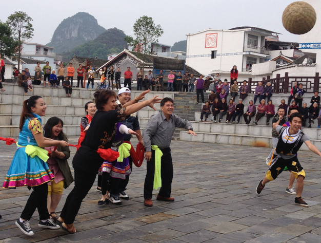 花蓮縣萬榮鄉參訪團成員在河池市羅城仫佬族自治縣東門鎮石圍古村體驗具有廣西民族特色的“竹球”