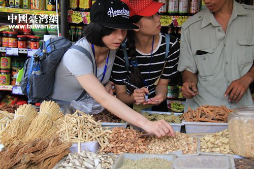 “好辣呀!”看著菜市場紅紅綠綠的辣椒,有臺灣學生忍不住嘗了一嘗,結果被辣得滿頭是汗。面對著市場上種類繁多的香料,學生們都非常好奇,仔細詢問它們的名字及用途。在親身體驗尋找、辯識香料的基礎上,來自四川旅游學院專業老師的一番評定、講解讓同學們對川菜香料有了全面的認識。