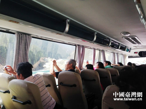 團員們在車上沿途拍攝果子溝大橋。(中國臺灣網 馬一娜 攝)
