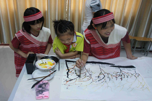 臺灣學生與文昌一小學生(中)共畫國畫。(圖片來源:四川省臺辦)
