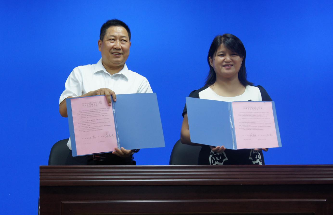 桃山小學校長蘇美娟(右)與文昌一小校長王義富(左)簽訂合作意向書。(圖片來源:四川省臺辦)