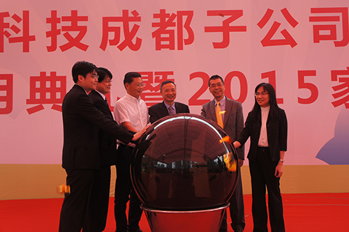 臺灣聯發科技成都新辦公樓正式啟用,四川省臺辦主任周敏謙(左四)、臺灣聯發科技董事長蔡明介(左五)等出席并共同觸發啟動球。