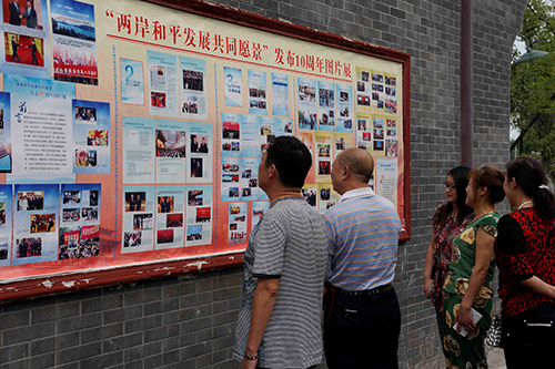 社區(qū)群眾觀看學(xué)習(xí)“兩岸和平發(fā)展共同愿景”發(fā)布10周年圖片展。(圖片來(lái)源:什邡市臺(tái)辦)